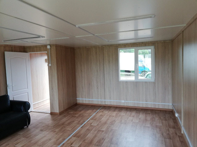 Стандартная комплектация: отделка стен - вагонка деревянная, отделка потолка - вагонка ПВХ, пол - линолеум, электрика, окно ПВХ с решеткой, дверь - деревянная, обитая металлическим листом с врезным замком.