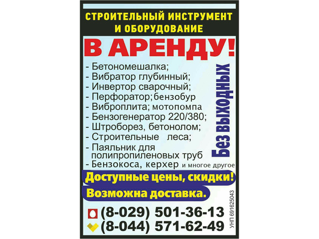 Здравствуйте, предлагаем Вам широкий выбор качественного профессионального инструмента и оборудования на прокат!!!Бетомешалки, мотобур, мотопомпа, бензогенератор 220/380V, бензогенератор 220 V, бензорез, штроборез, перфоратор, отбойный молоток, угловая шлифовальная машина(болгарка), вибратор глубинный, плиткорез, торцовачный станок, виброплита 63 , 90 кг ,строительный пылесос, електрорубанок, паяльник для полипропиленовых труб, мойка высокого давления, пушка тепловая (електро), електродрель,бензопила тачка строительная, строительные леса и мне. др. ИП Раэбицкова О.В. УНП 691625043 График работы: с 8-00 до 20-00 без выходных. Адрес: Дзержинск, ул Дружная д. 3.